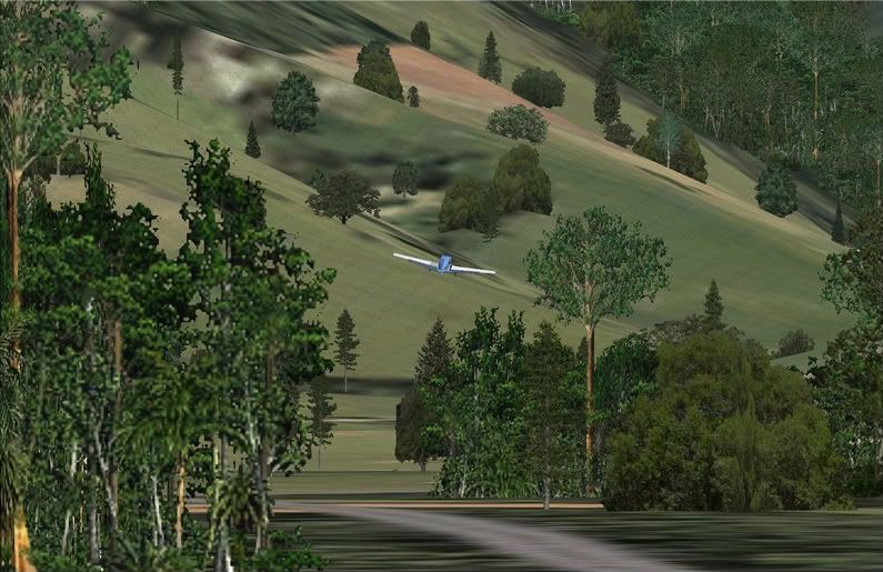 As we all know, the Mooney Bravo can take some effort to take off! I just managed to get off the runway, flew down this road and banked right to miss the approaching hills. A full tank was not a good idea. rolleyes.gif