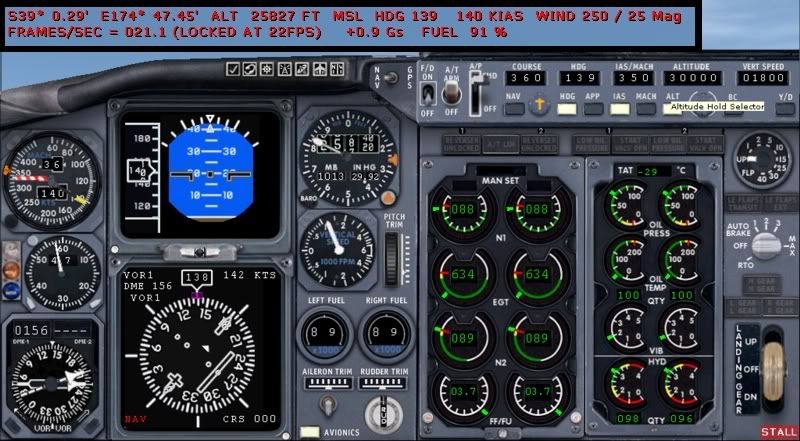 The Vista model flies fine, so long as you manage your airspeed/vertspeed. I note from the initial screenie that the VS is plugged in at 1800fpm, which for lower alts is perfectly fine for the 733, but at higher altitude, and at potentially heavy weights will be un-attainable. Since the default panel has no "Level Change" function, and with a fixed V/S set the autopilot will merely pitch to attain the pre-set vert speed with no reference to airspeed. So, in this scenario you will be climbing happily at 1800fpm and a respectable IAS until you pass the point at which the aircraft wont be able to continue making a good airspeed *and* match the pre-set vert speed. When this happens you will see a steady decrease in airspeed, meanwhile the nose will pitch up trying to make 1800fpm. This becomes a viscious cycle, as the slower you get, the more nose up you need to make the V/S, the higher the nose gets the slower the speed goes etc.....