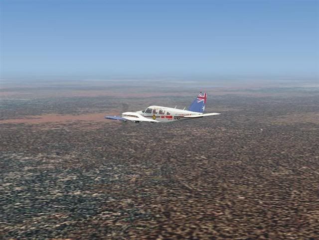 I arrived after a short 20 minutes, flying low at about 3000 feet before landing on runway 3 and climbing off again towards Argyle (YARG), a smaller town on the south western edge of the huge Lake Argyle. This trip was a little longer, lasting 58 minutes as I crossed approximately 145 miles of terrain (See screenshot 3: http://i35.photobucket.com/albums/d189/ ... point3.jpg and http://i35.photobucket.com/albums/d189/ ... point4.jpg ) that was noticeably more rougher than the flat central deserts. As I crossed the border from the Northern Territory into Western Australia, a strange combination of tones started beeping on my speakers that sounded like Morse Code or something! I tried cycling through different views but it wouldn't stop, repeating itself every two of three minutes until I switched off the airport after landing. I was heading at 285, and soon came across the southern top of the lake, (See screenshot 5: http://i35.photobucket.com/albums/d189/ ... point5.jpg ) which was a pleasant surprise as water was something I hadn't seen since departing from Perth! Just as I had said before, the blue sky contrasted brilliantly with the orange plains below, and the same principal also applied now as the fresh blue water lapped up on the dry orange shores (See screenshot 6: http://i35.photobucket.com/albums/d189/ ... point6.jpg )