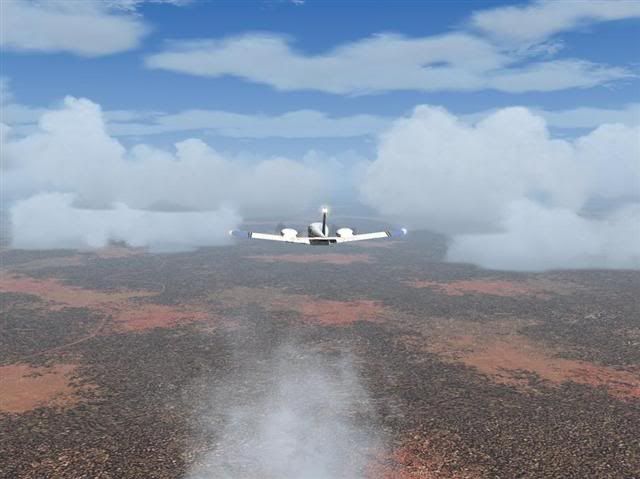 The next stop was a Military base called Tindal, sitting on the banks of the Daly River (An extension of the river mouth I flew past yesterday in the Joseph Bonaparte Gulf) about 97 miles south at a heading of 181. The trip would take me approximately 40 minutes, at a slower speed, with out the headwind that I had helping me on the previous hop. The weather began to clear up slightly (See screenshot 4: http://i35.photobucket.com/albums/d189/ ... point4.jpg ) and with the rain stopped, my visibility had increased to display lots of rugged terrain below me (See screenshot 5: http://i35.photobucket.com/albums/d189/ ... point5.jpg ) I then tuned into the airbase tower once I was 30nm and was told to land on runway 9, which meant I had to circle the airport before making a perfect full stop landing on the long wide tarmac runway used by the airforce jets. I taxied over to the pump that was right in front of a picturesque ATC tower (See screenshot 6: http://i35.photobucket.com/albums/d189/ ... point6.jpg ) and filled my tanks up to the max as it would be the last airport for miles with any fuel supply.