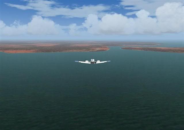 I climbed back up to my cruising altitude ready for the next trip across the sea, which was something I hadn't seen in a long, long time to the town of Port Keats, a distance of 110 miles in the direction of 043 degrees. As I banked right to chance my heading, I noticed a large river inlet to my side (See screenshot 6: http://i35.photobucket.com/albums/d189/ ... point6.jpg ) coming from the nearby ocean, but I had to turn away from in and fly in the opposite direction which felt un-natural as I went back deeper inland before the real coastline appeared in front of me (See screenshot 7: http://i35.photobucket.com/albums/d189/ ... point7.jpg ) It wasn't until 37 minutes later I descended into land, touching and going on runway 34 which was just a small dirt strip by the sea side.