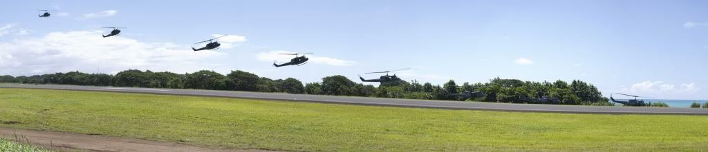 Each of the Hueys in this photo is an individual photo stitched together. The software is pretty good. You've got to look real hard to see the joins