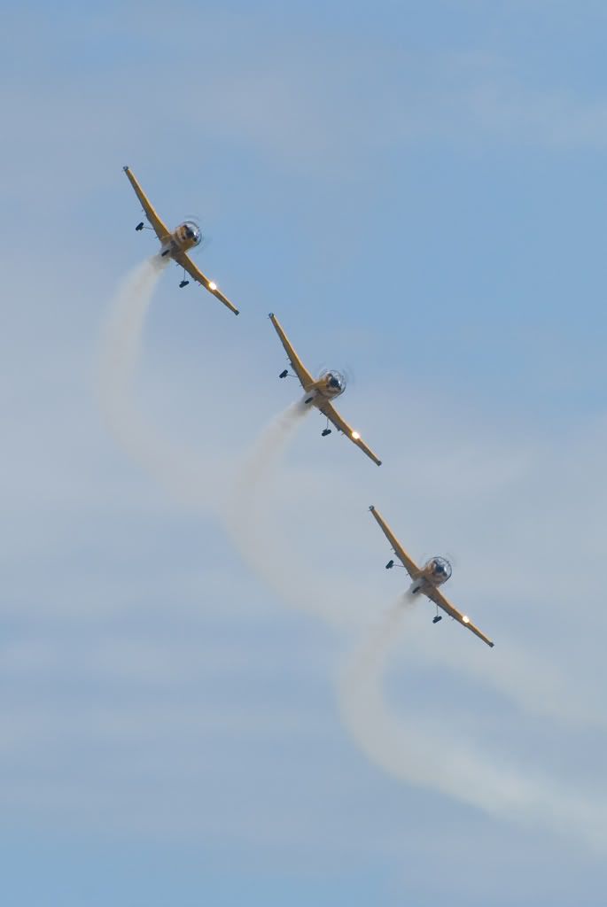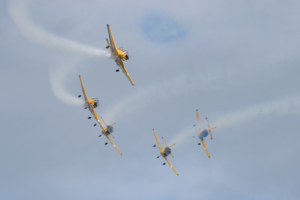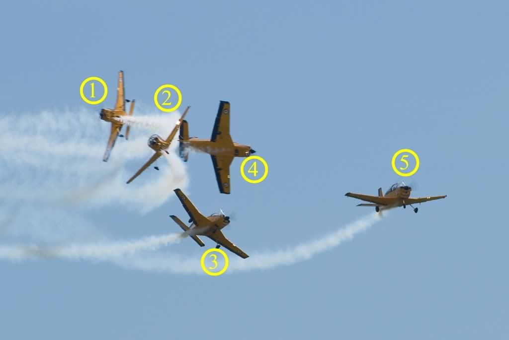 Its usually the last manuever of the show - the bomb burst or fan. Becuase the photo was taken with a long lens (300mm) it's compressed the depth of the photo and made them look all alot closer to each other than they really are.