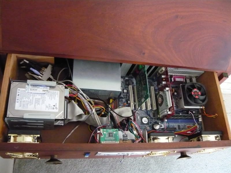 Motherboard mounted on metal plate which replaces wooden bottom draw.
