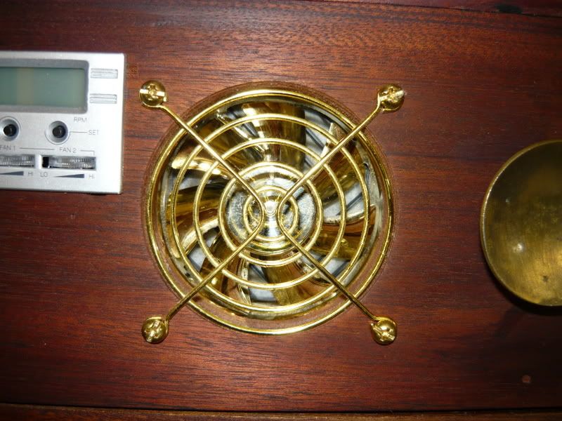 Close up of fan in a brass style to match mahogany desk brass fittings.
