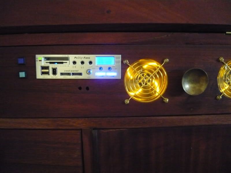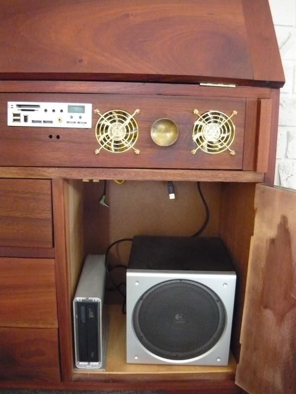 Excuse the basic question but where are the CD/DVD drives? Looks cool. The only issue I can see is that your fan control and temp monitoring is obscured by the drop down cupboard door. Other than that I love it.