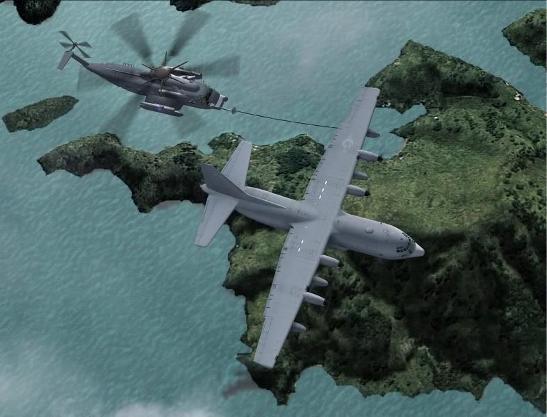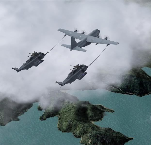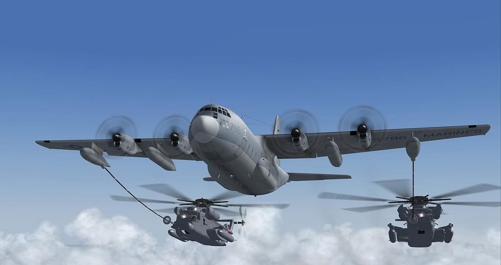 The CH-53 is a massive helicopter, and the sight of 2 of them sledding across the sky behind a C130 would be quite something in RL.