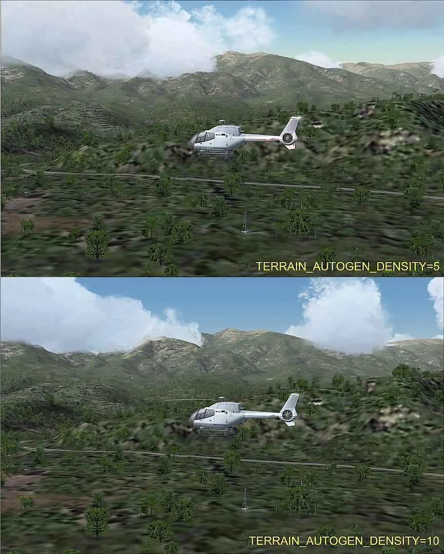 FS9 users can now increase the number of autogen trees in their scenery (FS limits the number of trees to something like 300 per tile) by changing the following line in the [Terrain] section of the fs9.cfg file: