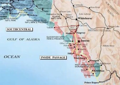 Petersburg was named after Peter Buschmann, a Norwegian immigrant who arrived in the late 1890s. He built a cannery (thanks to the plentiful number of icebergs from the nearby LeConte Glacier which would provide a source for cooling fish), a sawmill, and a dock between 1890 and 1900. His family's homesteads grew into Petersburg which, by 1910 was incorporated and was populated largely by people of Scandinavian origin thus giving Petersburg the nickname "Little Norway". May 17 (Norwegian Constitution Day) is celebrated annually in Petersburg on the third weekend in May. The cannery, along with three others have operated continuously since their completion. Petersburg is one of Alaska's major fishing communities. pop 3200 and has its own Alaskan Airlines jet service (it would be like Air NZ have a regular 737 service to Katikati!). Petersburg can only be accessed by air or sea hence the 737 service.