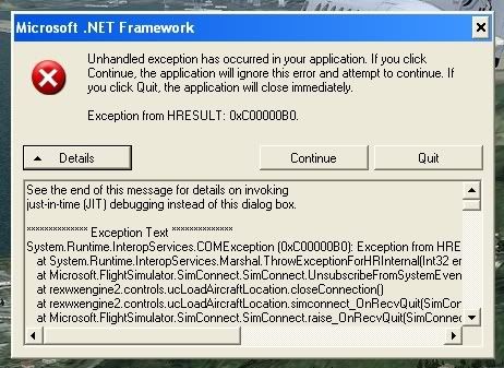at rexwxengine2.controls.ucLoadAircraftLocation.simconnect_OnRecvQuit(SimConnect sender, SIMCONNECT_RECV data)