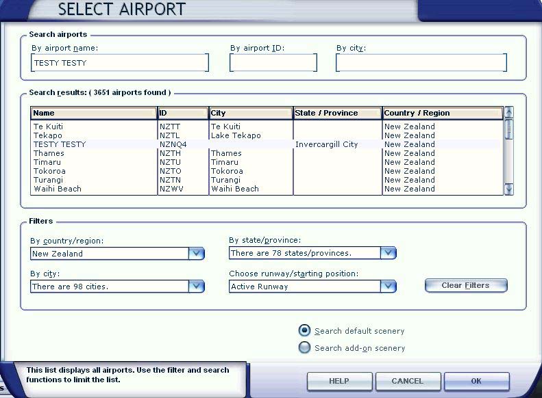 Well guys I have a bit of a head scratcher for you. Over the past couple of weeks I have been adding AVSim and VLC scenery & airports around New Zealand to my scenery library. The other day I notice a strange entry 'TESTY TESTY' in my FSX 'Select Airport' page.