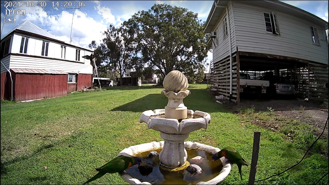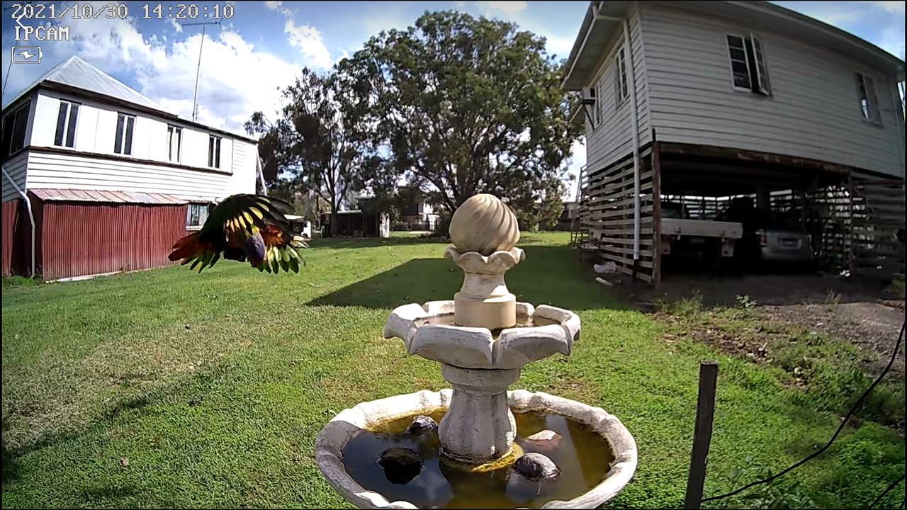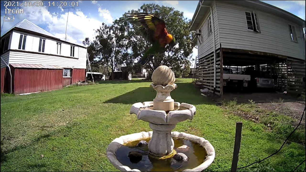 I bought a solar charged wifi security cam, to get closer to the birdbath, and fluked this sequence of lorikeets landing while I was finding a good viewing spot.