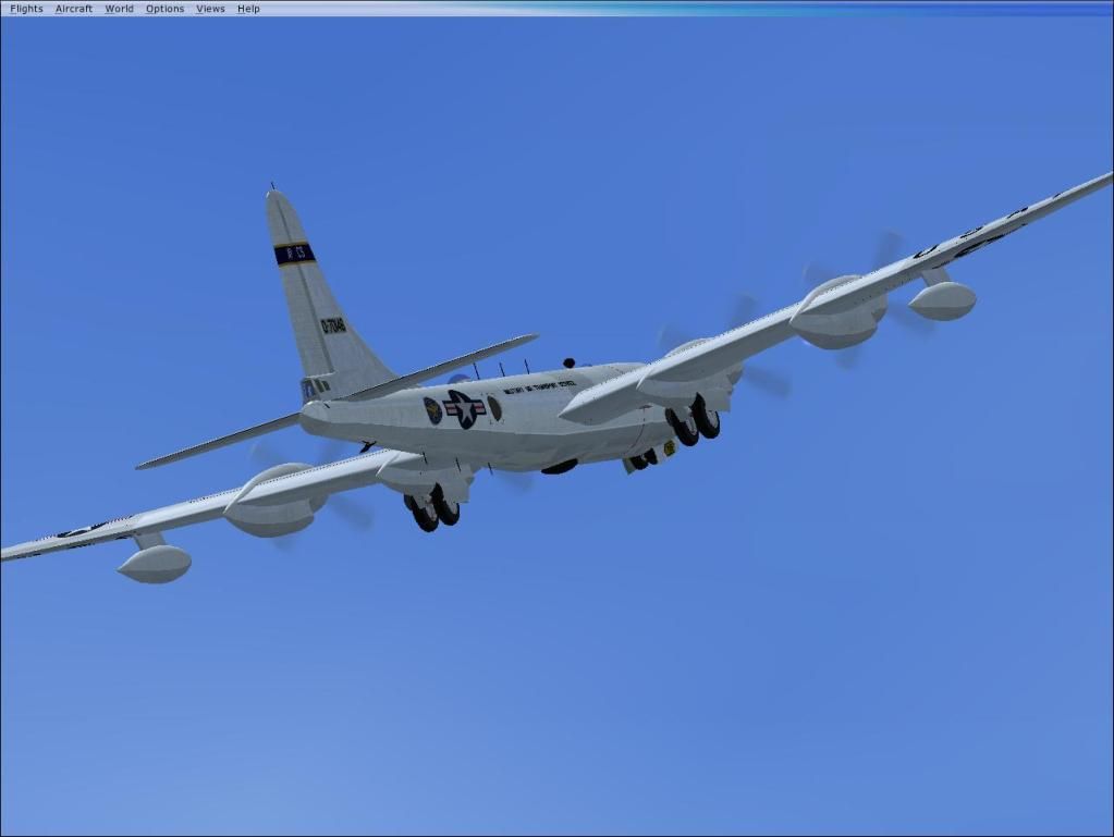 The Superfortress is a RB-50F, not KB-50. I have my refuelling covered with a KC-135T, but an AI would be great.(Know of any? Working boom is even better.) I've heard that the Stratocruiser is very hard to fly, probably not the plane for me. I really do like the flying wings, with their usually sleek looks. The Ho-229 is my third, I will post pictures of the new N9M later in the week. I have some Mercator, lots of Lightnings, and maybe some vintage british warbirds on the "Ike" (CVN-69) coming up, just need to find time to fly them. dry.gif