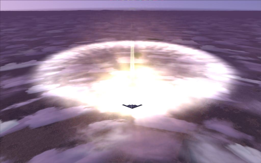 B2 Steath Bomber with NukemV2, the most lethal weapon for FS9/FS2004. The new NukemV2 effect has a new dropping bomb with bomb whistling and detonation sounds. Also more realistic dynamics. Cruise at 25,000 to 35,000 feet, drop the bomb, and it falls rearward. Then.... boom... flash and destruction. Then the almighty mushroom cloud. This is the closest you will ever get to the real thing. So use it responsibly.