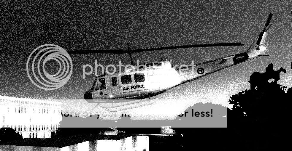 Photo of a RNZAF Bell Iroquois taken at dawn near Hobsonville by a photographer for the Auckland Herald in the late 80s. He was using 1600 ASA film pushed to 3200 ASA to capture a sharp image of the blades, forgetting about the amount of grain that'd be in the photo. Contrast is up the spout coz developing b&w film that has been pushed past its normal limits can be a bit dicey.
