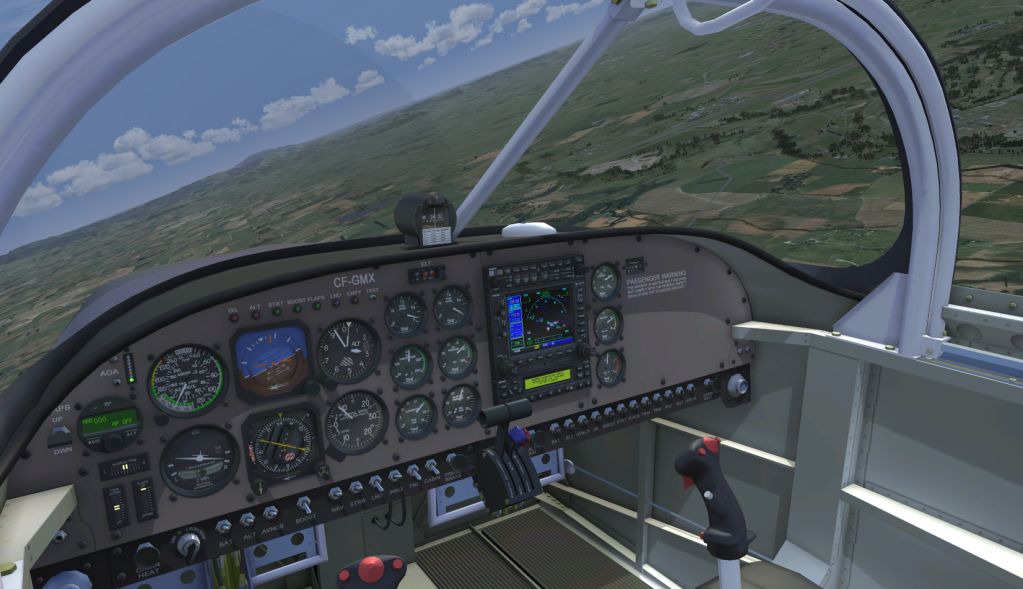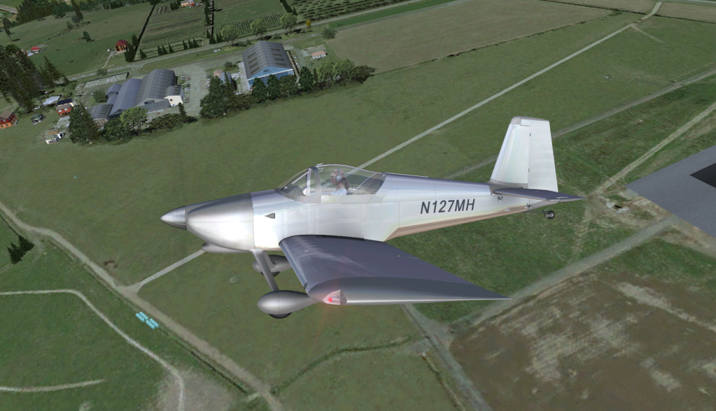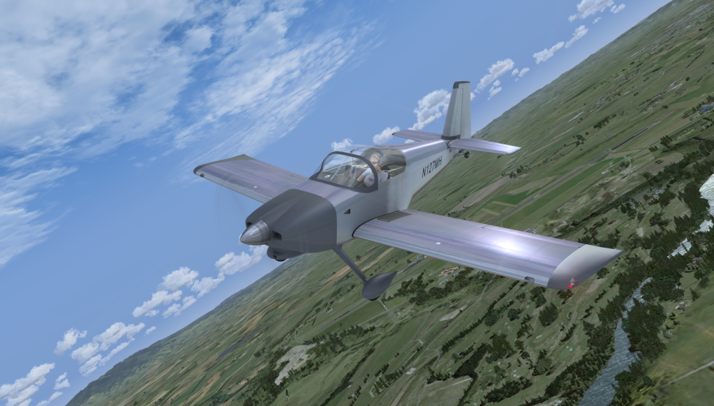 At last I have shelled out the NZ $47 cost of the new RV7. I took a few snapshots on the maiden flight after initial run up on the ground. Its flys like it looks and is a real rocket ship. The exterior is as good as anything on the market but the interior however detailed, is a little lack luster. eg. No 3d glass gauges or bump mapping of textures. That been said, I will be spending a lot of hrs in this babby. 4 variations a mixture of RV7 and RV7A versions with tilt forward or sliding canopys. I hope a few NZ paint schemes pop up.
