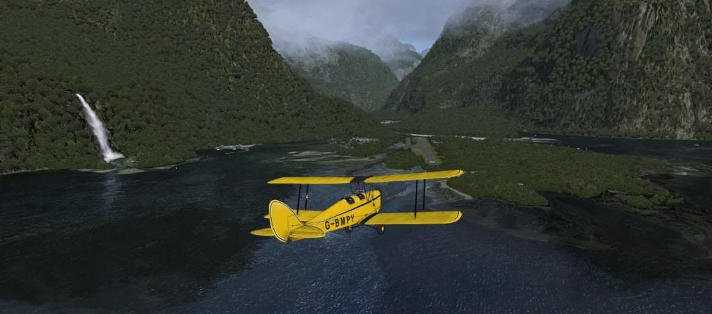 Ants Tiger Moth lining up to land at Milford Sound