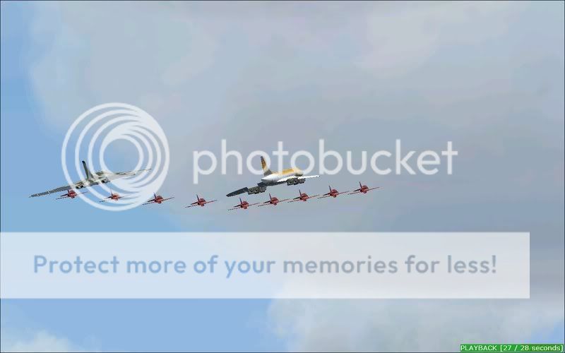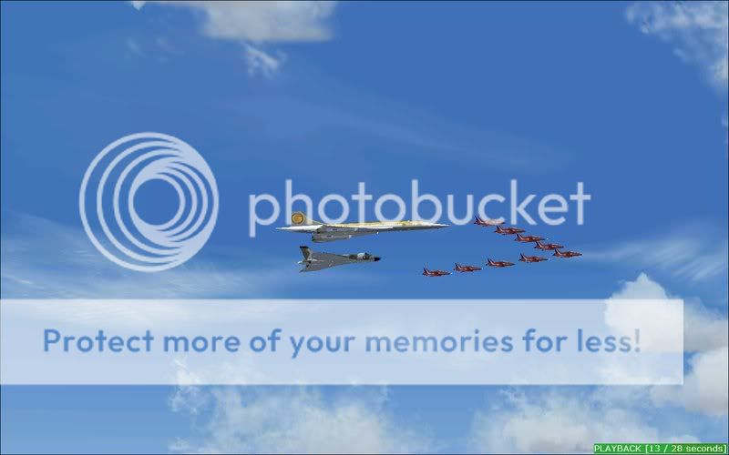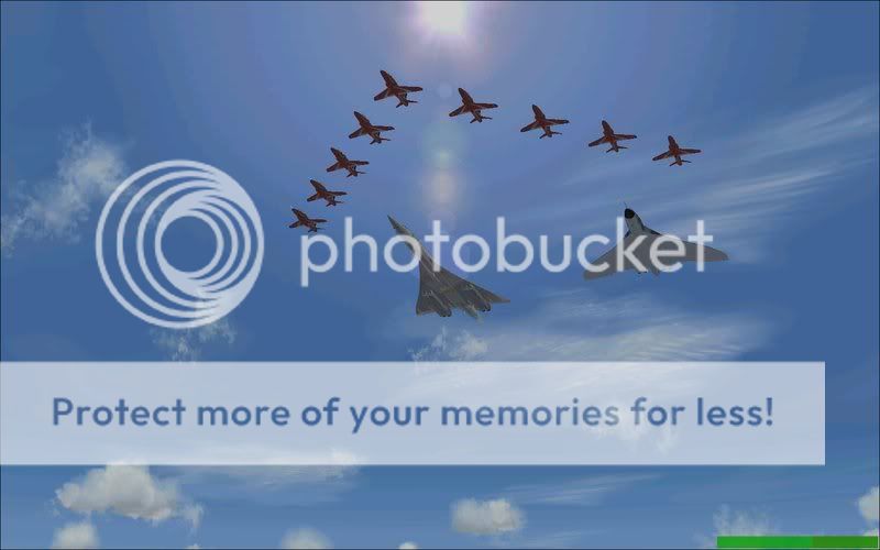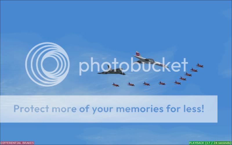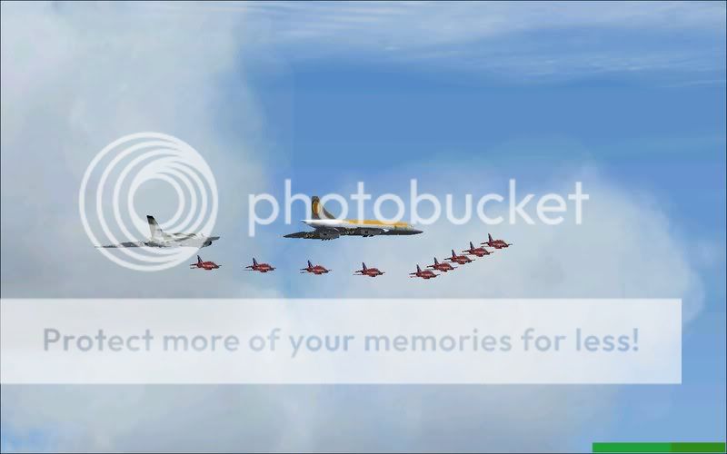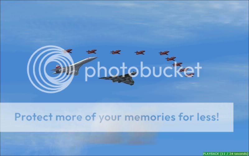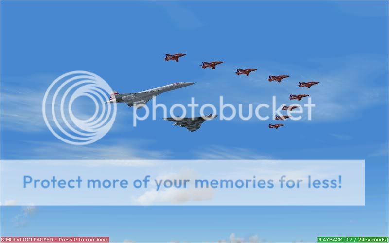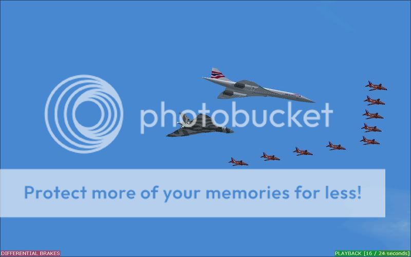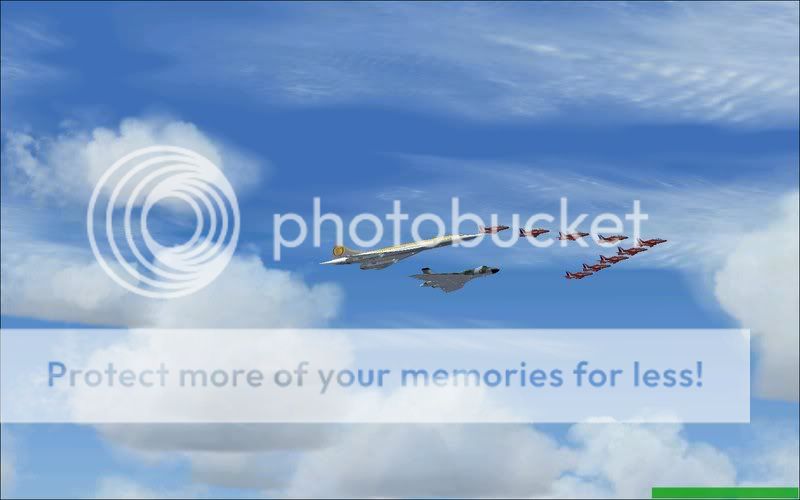 Yup, you read it right, I've done a formation that maybe in the forseeable future could be a reality in some peoples minds, none other thn the almighty Concorde (unfortunately in a fantasy livery as I don't have a British Airways or Air France version, credit still goes to Orange Air), the ever-loved Vulcan, and the ever renowned Red Arrows