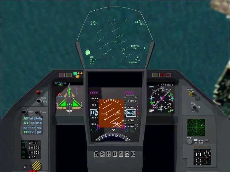Several months ago I downloaded Cyril P's Rafale model, as it was the best available for FS2004. There were however a number of things that I didn't like about it. First was the HUD - it was borrowed from Kirk Olsen's F-16, and didn't even remotely match what the released photos and videos of the Rafale's HUD showed, not to mention the resolution and focus were off as well as being too light colored to even see unless you had it against a dark background like water. My second peeve was that for the life of me, despite multiple tries to fix it, I have yet to get the afterburner effect to work. Mind you, this thing moves - move your throttle lever about halfway up and the this Rafale shoots off like a bullet, and when the throttle is firewalled, she goes from 450kts to over 700kts in just a few seconds. There are two amber lights on the EICAS panel in the lower right of the cockpit that are supposed to indicate when the afterburner is engaged - but judging by the aircrafts acceleration, these are for display only as "Shift-F4 has no noticeable effect on acceleration. Also, you can't adjust the loadout on it - so all you have are two Matra Magic AAM's on the wingtips. My last wish for the aircraft, and it's once again a panel issue - is that I wish the Multifunction displays were indeed multifunction.